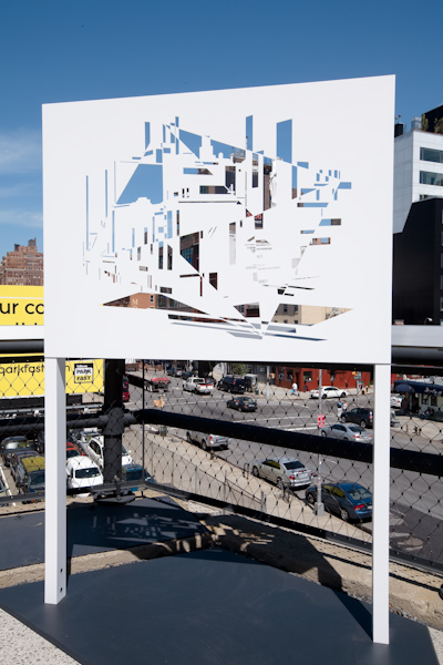 The piece functions in a manner similar to his cut photographs, but will use the view from one point on the High Line as its raw material. Park visitors will look through a viewing apparatus, lined up with a metal screen from which geometric shapes have been cut. Precise alignment of these two devices with the buildings behind them will transform what is seen. By blocking some details of the nearby buildings and revealing others, the artwork will make them appear as optically flattened elements in an abstract composition.