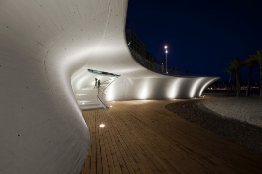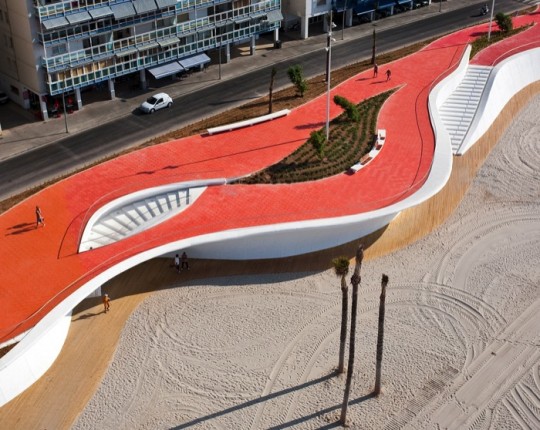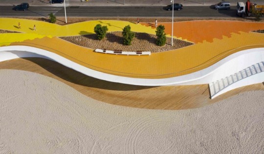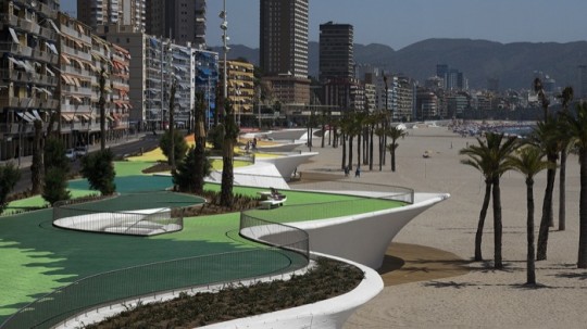 Abitare Design Magazine had a post about this gorgeous oceanfront promenade in Benidorm, Spain. The boardwalk was designed by OAB, an architectural firm in Barcelona. I love the colors and the organic undulation of the waves. A beautiful design.